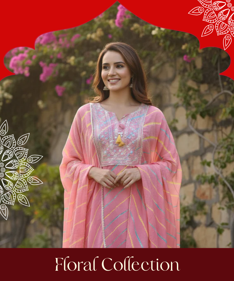 Floral Print Cotton Kurta Set with Striped Dupatta