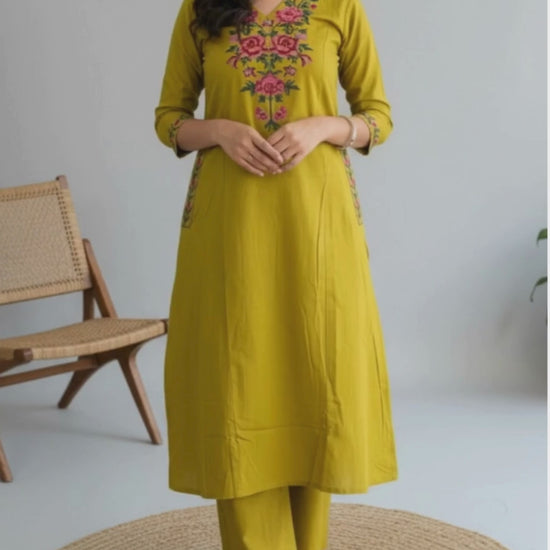 This elegant mustard yellow kurta set for women combines traditional embroidery with a contemporary silhouette, offering both style and comfort. Crafted with attention to detail, the intricate embroidery enhances the vibrant hue, making it an ideal choice for festive occasions or casual celebrations. The breathable fabric ensures all-day comfort while maintaining a refined look. Perfect for those seeking a sophisticated yet vibrant outfit that stands out with subtle artistry.