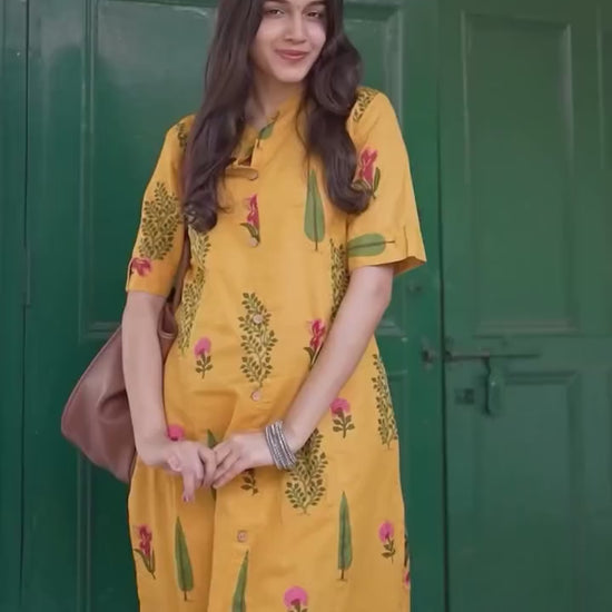 This elegant Mustard Yellow Floral Printed Kurta Set for Women showcases a perfect balance of traditional charm and everyday comfort. Designed in a warm mustard hue, the kurta is adorned with delicate handblock-inspired floral and leaf motifs, creating a graceful ethnic look that feels both timeless and contemporary. The subtle contrast of earthy tones enhances the visual appeal while maintaining a refined, minimal aesthetic.