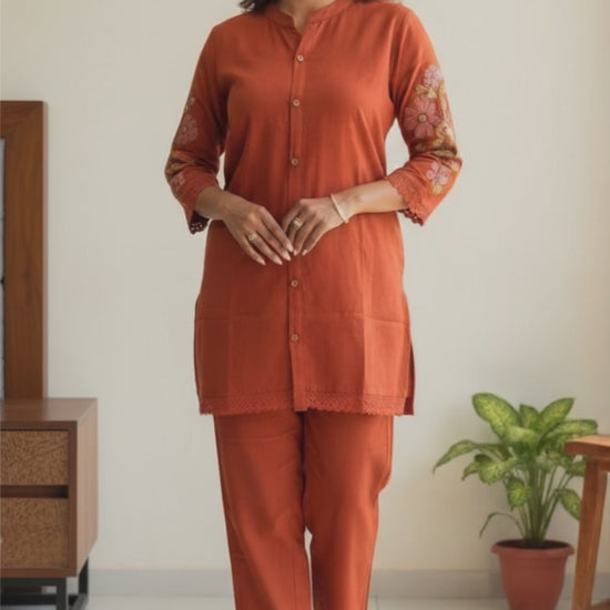 Rust Orange Co-ord Set with Subtle Embroidery Accents
